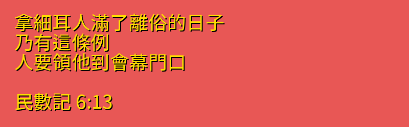今日分享的中文聖經:「拿細耳人滿了離俗的日子、乃有這條例.人要領他到會幕門口.」來自聖經「民數記」第「6章13節」,你可以繼續向下拉看到聖經卷書完整章節。每日中文聖經從神的話語中聆聽神的聲音,引導我們的人生,指導我們人生的方向,讓我們做出正確的選擇,而做出這些正確選擇的原則都在聖經中,所以我們需要讀神的話語,認識他的話語,把神的話語藏在心裡。