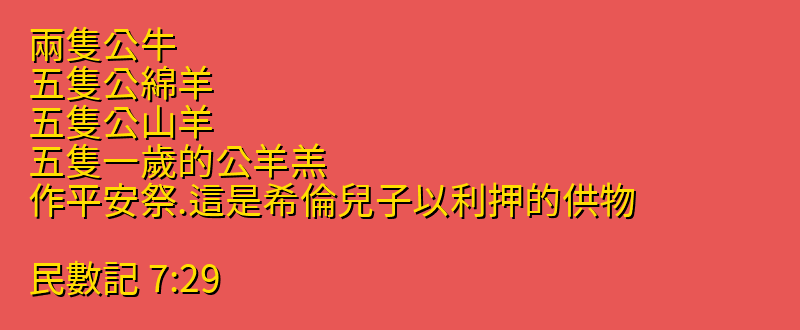 今日分享的中文聖經:「兩隻公牛、五隻公綿羊、五隻公山羊、五隻一歲的公羊羔、作平安祭.這是希倫兒子以利押的供物。」來自聖經「民數記」第「7章29節」,你可以繼續向下拉看到聖經卷書完整章節。每日中文聖經從神的話語中聆聽神的聲音,引導我們的人生,指導我們人生的方向,讓我們做出正確的選擇,而做出這些正確選擇的原則都在聖經中,所以我們需要讀神的話語,認識他的話語,把神的話語藏在心裡。