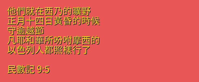 今日分享的中文聖經:「他們就在西乃的曠野、正月十四日黃昏的時候、守逾越節.凡耶和華所吩咐摩西的、以色列人都照樣行了。」來自聖經「民數記」第「9章5節」,你可以繼續向下拉看到聖經卷書完整章節。每日中文聖經從神的話語中聆聽神的聲音,引導我們的人生,指導我們人生的方向,讓我們做出正確的選擇,而做出這些正確選擇的原則都在聖經中,所以我們需要讀神的話語,認識他的話語,把神的話語藏在心裡。