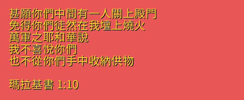 甚願你們中間有一人關上殿門、免得你們徒然在我壇上燒火。萬軍之耶和華說、我不喜悅你們、也不從你們手中收納供物。