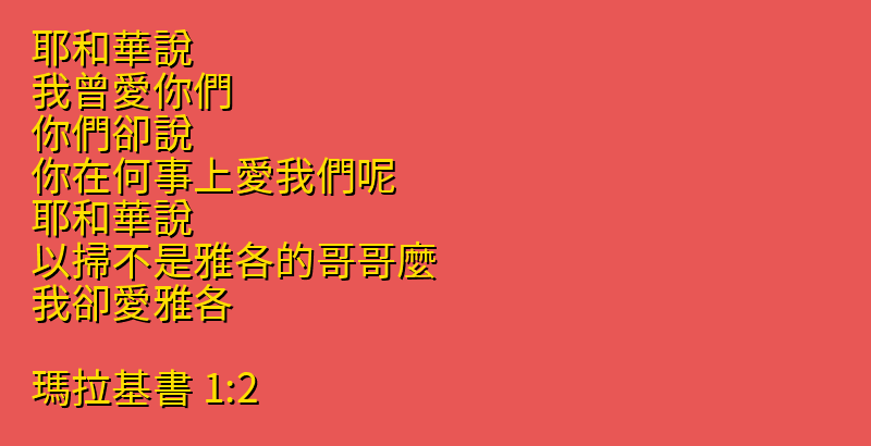 耶和華說、我曾愛你們.你們卻說、你在何事上愛我們呢.耶和華說、以掃不是雅各的哥哥麼.我卻愛雅各、