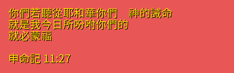 今日分享的中文聖經:「你們若聽從耶和華你們 神的誡命、就是我今日所吩咐你們的、就必蒙福。」來自聖經「申命記」第「11章27節」,你可以繼續向下拉看到聖經卷書完整章節。每日中文聖經從神的話語中聆聽神的聲音,引導我們的人生,指導我們人生的方向,讓我們做出正確的選擇,而做出這些正確選擇的原則都在聖經中,所以我們需要讀神的話語,認識他的話語,把神的話語藏在心裡。