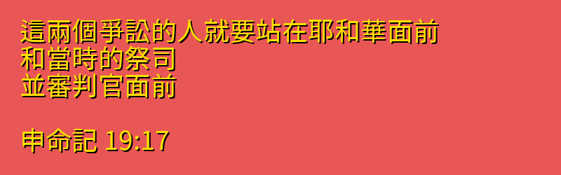 今日分享的中文聖經:「這兩個爭訟的人就要站在耶和華面前、和當時的祭司、並審判官面前、」來自聖經「申命記」第「19章17節」,你可以繼續向下拉看到聖經卷書完整章節。每日中文聖經從神的話語中聆聽神的聲音,引導我們的人生,指導我們人生的方向,讓我們做出正確的選擇,而做出這些正確選擇的原則都在聖經中,所以我們需要讀神的話語,認識他的話語,把神的話語藏在心裡。