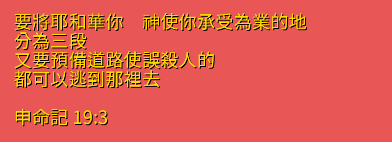 要將耶和華你 神使你承受為業的地、分為三段、又要預備道路使誤殺人的、都可以逃到那裡去。