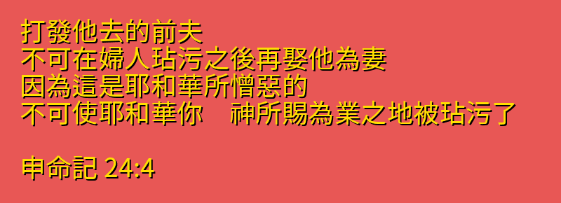 打發他去的前夫、不可在婦人玷污之後再娶他為妻、因為這是耶和華所憎惡的.不可使耶和華你 神所賜為業之地被玷污了。