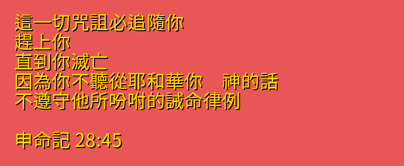 這一切咒詛必追隨你、趕上你、直到你滅亡、因為你不聽從耶和華你 神的話、不遵守他所吩咐的誡命律例。