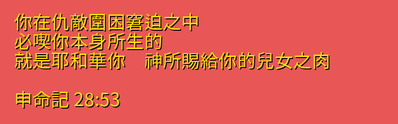 你在仇敵圍困窘迫之中、必喫你本身所生的、就是耶和華你 神所賜給你的兒女之肉。