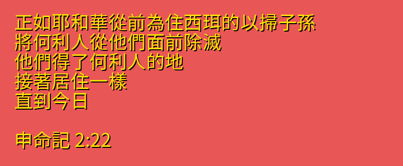 • 2:22 正如耶和華從前為住西珥的以掃子孫、將何利人從他們面前除滅.他們得了何利人的地、接著居住一樣、直到今日。