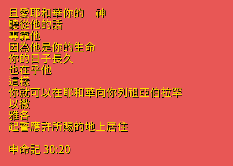 且愛耶和華你的 神、聽從他的話、專靠他、因為他是你的生命.你的日子長久、也在乎他.這樣、你就可以在耶和華向你列祖亞伯拉罕、以撒、雅各、起誓應許所賜的地上居住。
