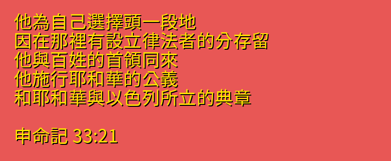 今日分享的中文聖經:「他為自己選擇頭一段地、因在那裡有設立律法者的分存留.他與百姓的首領同來、他施行耶和華的公義、和耶和華與以色列所立的典章。」來自聖經「申命記」第「33章21節」,你可以繼續向下拉看到聖經卷書完整章節。每日中文聖經從神的話語中聆聽神的聲音,引導我們的人生,指導我們人生的方向,讓我們做出正確的選擇,而做出這些正確選擇的原則都在聖經中,所以我們需要讀神的話語,認識他的話語,把神的話語藏在心裡。