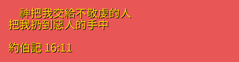 今日分享的中文聖經:「 神把我交給不敬虔的人、把我扔到惡人的手中。」來自聖經「約伯記」第「16章11節」,你可以繼續向下拉看到聖經卷書完整章節。每日中文聖經從神的話語中聆聽神的聲音,引導我們的人生,指導我們人生的方向,讓我們做出正確的選擇,而做出這些正確選擇的原則都在聖經中,所以我們需要讀神的話語,認識他的話語,把神的話語藏在心裡。