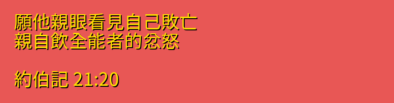 今日分享的中文聖經:「願他親眼看見自己敗亡、親自飲全能者的忿怒。」來自聖經「約伯記」第「21章20節」,你可以繼續向下拉看到聖經卷書完整章節。每日中文聖經從神的話語中聆聽神的聲音,引導我們的人生,指導我們人生的方向,讓我們做出正確的選擇,而做出這些正確選擇的原則都在聖經中,所以我們需要讀神的話語,認識他的話語,把神的話語藏在心裡。