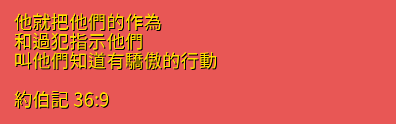 今日分享的中文聖經:「他就把他們的作為、和過犯指示他們、叫他們知道有驕傲的行動。」來自聖經「約伯記」第「36章9節」,你可以繼續向下拉看到聖經卷書完整章節。每日中文聖經從神的話語中聆聽神的聲音,引導我們的人生,指導我們人生的方向,讓我們做出正確的選擇,而做出這些正確選擇的原則都在聖經中,所以我們需要讀神的話語,認識他的話語,把神的話語藏在心裡。