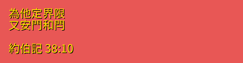今日分享的中文聖經:「為他定界限、又安門和閂、」來自聖經「約伯記」第「38章10節」,你可以繼續向下拉看到聖經卷書完整章節。每日中文聖經從神的話語中聆聽神的聲音,引導我們的人生,指導我們人生的方向,讓我們做出正確的選擇,而做出這些正確選擇的原則都在聖經中,所以我們需要讀神的話語,認識他的話語,把神的話語藏在心裡。