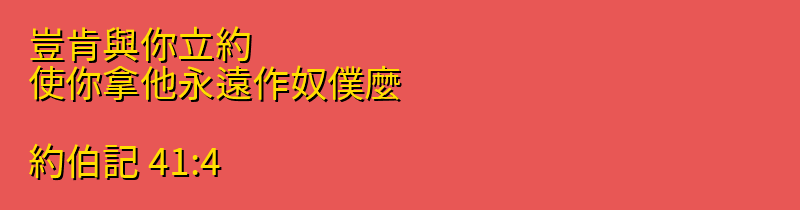 今日分享的中文聖經:「豈肯與你立約、使你拿他永遠作奴僕麼。」來自聖經「約伯記」第「41章4節」,你可以繼續向下拉看到聖經卷書完整章節。每日中文聖經從神的話語中聆聽神的聲音,引導我們的人生,指導我們人生的方向,讓我們做出正確的選擇,而做出這些正確選擇的原則都在聖經中,所以我們需要讀神的話語,認識他的話語,把神的話語藏在心裡。