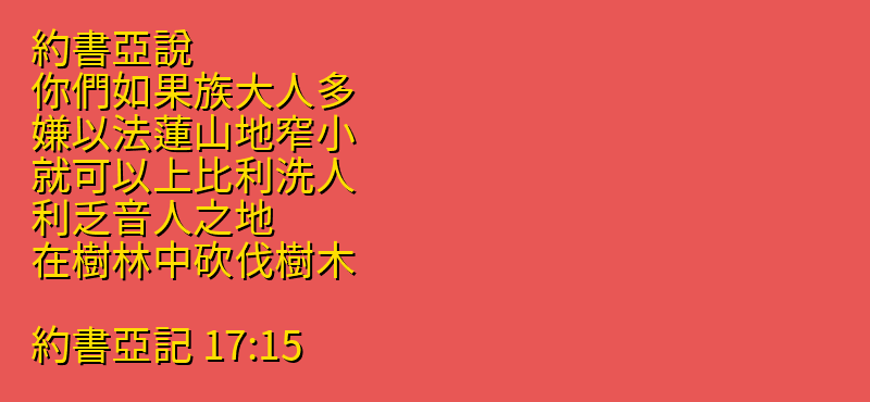 約書亞說、你們如果族大人多、嫌以法蓮山地窄小、就可以上比利洗人、利乏音人之地、在樹林中砍伐樹木。