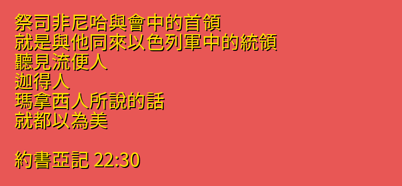 今日分享的中文聖經:「祭司非尼哈與會中的首領、就是與他同來以色列軍中的統領、聽見流便人、迦得人、瑪拿西人所說的話、就都以為美。」來自聖經「約書亞記」第「22章30節」,你可以繼續向下拉看到聖經卷書完整章節。每日中文聖經從神的話語中聆聽神的聲音,引導我們的人生,指導我們人生的方向,讓我們做出正確的選擇,而做出這些正確選擇的原則都在聖經中,所以我們需要讀神的話語,認識他的話語,把神的話語藏在心裡。