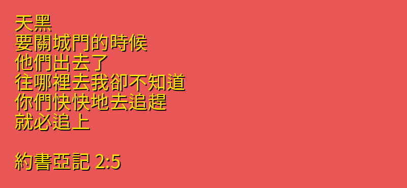 今日分享的中文聖經:「天黑、要關城門的時候、他們出去了.往哪裡去我卻不知道.你們快快地去追趕、就必追上。」來自聖經「約書亞記」第「2章5節」,你可以繼續向下拉看到聖經卷書完整章節。每日中文聖經從神的話語中聆聽神的聲音,引導我們的人生,指導我們人生的方向,讓我們做出正確的選擇,而做出這些正確選擇的原則都在聖經中,所以我們需要讀神的話語,認識他的話語,把神的話語藏在心裡。