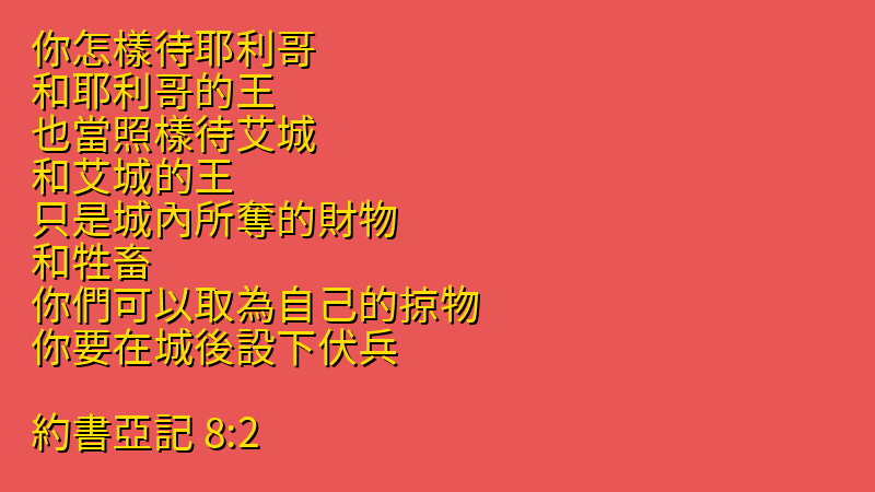 你怎樣待耶利哥、和耶利哥的王、也當照樣待艾城、和艾城的王.只是城內所奪的財物、和牲畜、你們可以取為自己的掠物.你要在城後設下伏兵。