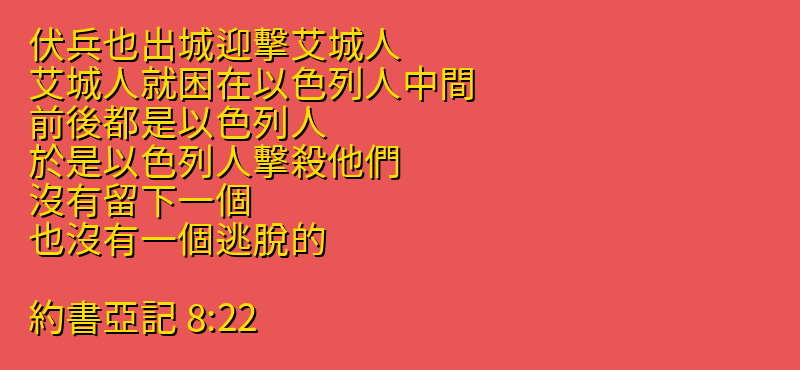 今日分享的中文聖經:「伏兵也出城迎擊艾城人.艾城人就困在以色列人中間、前後都是以色列人.於是以色列人擊殺他們、沒有留下一個、也沒有一個逃脫的.」來自聖經「約書亞記」第「8章22節」,你可以繼續向下拉看到聖經卷書完整章節。每日中文聖經從神的話語中聆聽神的聲音,引導我們的人生,指導我們人生的方向,讓我們做出正確的選擇,而做出這些正確選擇的原則都在聖經中,所以我們需要讀神的話語,認識他的話語,把神的話語藏在心裡。