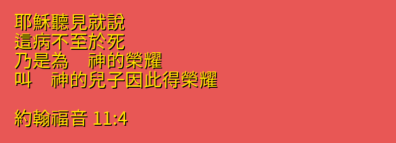 耶穌聽見就說、這病不至於死、乃是為 神的榮耀、叫 神的兒子因此得榮耀。