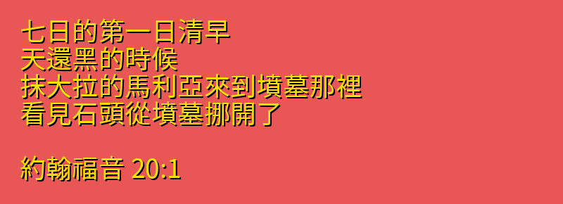 - 20:1 七日的第一日清早、天還黑的時候、抹大拉的馬利亞來到墳墓那裡、看見石頭從墳墓挪開了.