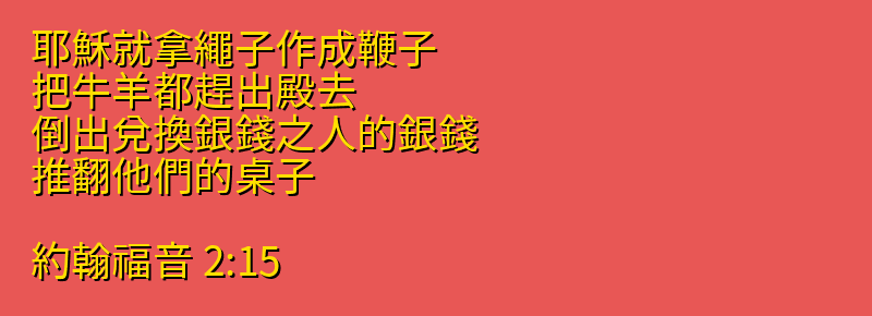 耶穌就拿繩子作成鞭子、把牛羊都趕出殿去.倒出兌換銀錢之人的銀錢、推翻他們的桌子。