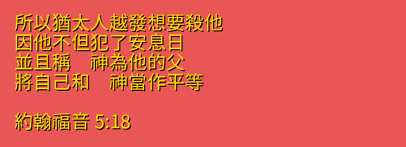 所以猶太人越發想要殺他.因他不但犯了安息日、並且稱 神為他的父、將自己和 神當作平等。