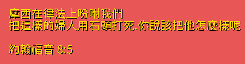 今日分享的中文聖經:「摩西在律法上吩咐我們、把這樣的婦人用石頭打死.你說該把他怎麼樣呢。」來自聖經「約翰福音」第「8章5節」,你可以繼續向下拉看到聖經卷書完整章節。每日中文聖經從神的話語中聆聽神的聲音,引導我們的人生,指導我們人生的方向,讓我們做出正確的選擇,而做出這些正確選擇的原則都在聖經中,所以我們需要讀神的話語,認識他的話語,把神的話語藏在心裡。