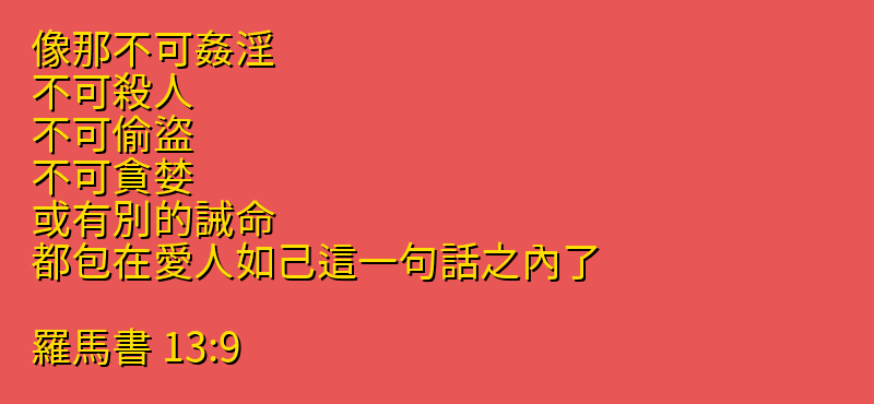 像那不可姦淫、不可殺人、不可偷盜、不可貪婪、或有別的誡命、都包在愛人如己這一句話之內了。