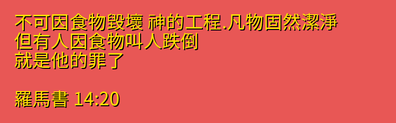 不可因食物毀壞 神的工程.凡物固然潔淨、但有人因食物叫人跌倒、就是他的罪了。