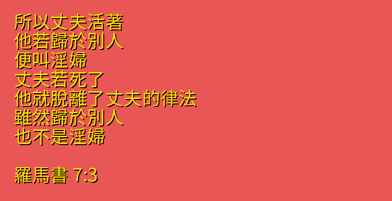 • 7:3 所以丈夫活著、他若歸於別人、便叫淫婦.丈夫若死了、他就脫離了丈夫的律法、雖然歸於別人、也不是淫婦。