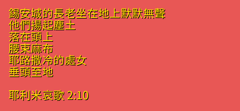 錫安城的長老坐在地上默默無聲.他們揚起塵土、落在頭上、腰束麻布.耶路撒冷的處女、垂頭至地。