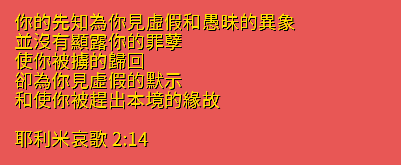 • 2:14 你的先知為你見虛假和愚昧的異象、並沒有顯露你的罪孽、使你被擄的歸回.卻為你見虛假的默示、和使你被趕出本境的緣故。