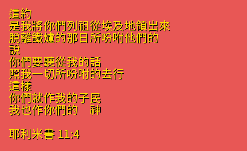 今日分享的中文聖經:「這約、是我將你們列祖從埃及地領出來、脫離鐵爐的那日所吩咐他們的、說、你們要聽從我的話、照我一切所吩咐的去行.這樣、你們就作我的子民、我也作你們的 神.」來自聖經「耶利米書」第「11章4節」,你可以繼續向下拉看到聖經卷書完整章節。每日中文聖經從神的話語中聆聽神的聲音,引導我們的人生,指導我們人生的方向,讓我們做出正確的選擇,而做出這些正確選擇的原則都在聖經中,所以我們需要讀神的話語,認識他的話語,把神的話語藏在心裡。