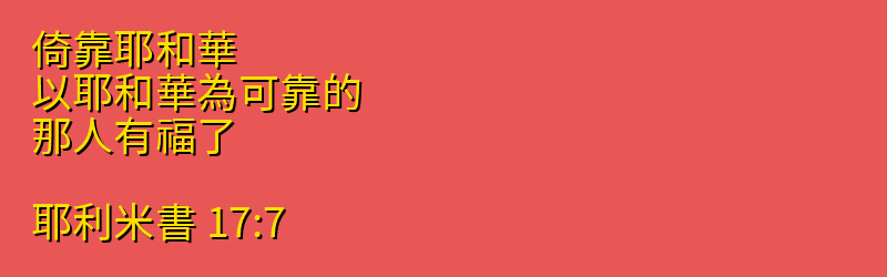 今日分享的中文聖經:「倚靠耶和華、以耶和華為可靠的、那人有福了。」來自聖經「耶利米書」第「17章7節」,你可以繼續向下拉看到聖經卷書完整章節。每日中文聖經從神的話語中聆聽神的聲音,引導我們的人生,指導我們人生的方向,讓我們做出正確的選擇,而做出這些正確選擇的原則都在聖經中,所以我們需要讀神的話語,認識他的話語,把神的話語藏在心裡。