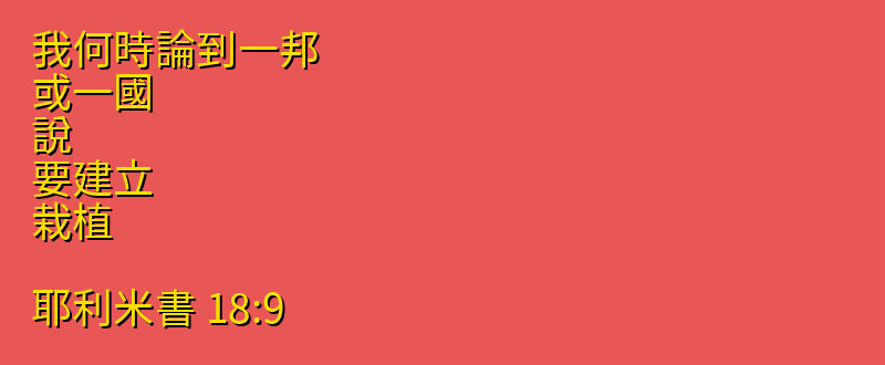 今日分享的中文聖經:「我何時論到一邦、或一國、說、要建立、栽植.」來自聖經「耶利米書」第「18章9節」,你可以繼續向下拉看到聖經卷書完整章節。每日中文聖經從神的話語中聆聽神的聲音,引導我們的人生,指導我們人生的方向,讓我們做出正確的選擇,而做出這些正確選擇的原則都在聖經中,所以我們需要讀神的話語,認識他的話語,把神的話語藏在心裡。