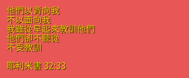 今日分享的中文聖經:「他們以背向我、不以面向我.我雖從早起來教訓他們、他們卻不聽從、不受教訓.」來自聖經「耶利米書」第「32章33節」,你可以繼續向下拉看到聖經卷書完整章節。每日中文聖經從神的話語中聆聽神的聲音,引導我們的人生,指導我們人生的方向,讓我們做出正確的選擇,而做出這些正確選擇的原則都在聖經中,所以我們需要讀神的話語,認識他的話語,把神的話語藏在心裡。