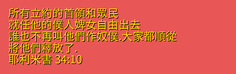 今日分享的中文聖經:「所有立約的首領和眾民、就任他的僕人婢女自由出去、誰也不再叫他們作奴僕.大家都順從、將他們釋放了.」來自聖經「耶利米書」第「34章10節」,你可以繼續向下拉看到聖經卷書完整章節。每日中文聖經從神的話語中聆聽神的聲音,引導我們的人生,指導我們人生的方向,讓我們做出正確的選擇,而做出這些正確選擇的原則都在聖經中,所以我們需要讀神的話語,認識他的話語,把神的話語藏在心裡。