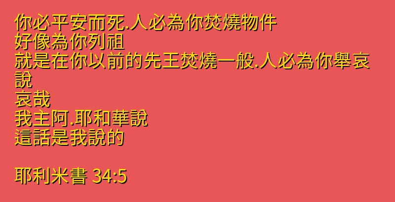 你必平安而死.人必為你焚燒物件、好像為你列祖、就是在你以前的先王焚燒一般.人必為你舉哀、說、哀哉、我主阿.耶和華說、這話是我說的。