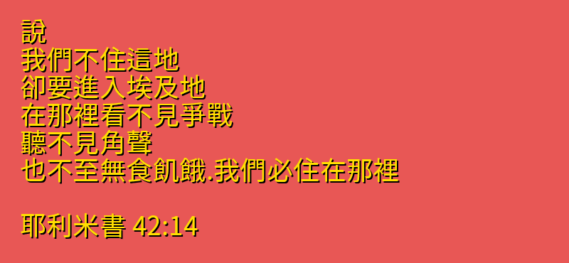 今日分享的中文聖經:「說、我們不住這地、卻要進入埃及地、在那裡看不見爭戰、聽不見角聲、也不至無食飢餓.我們必住在那裡。」來自聖經「耶利米書」第「42章14節」,你可以繼續向下拉看到聖經卷書完整章節。每日中文聖經從神的話語中聆聽神的聲音,引導我們的人生,指導我們人生的方向,讓我們做出正確的選擇,而做出這些正確選擇的原則都在聖經中,所以我們需要讀神的話語,認識他的話語,把神的話語藏在心裡。