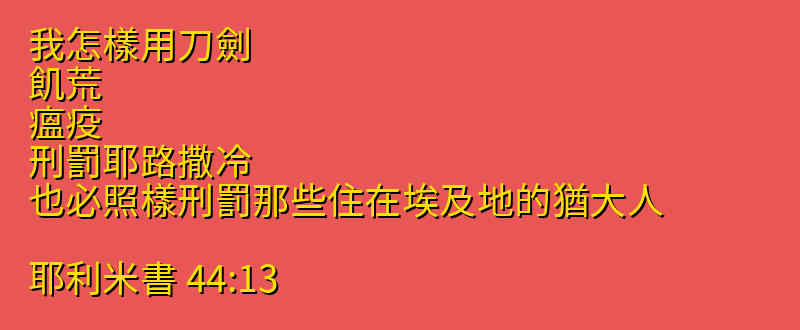 我怎樣用刀劍、飢荒、瘟疫、刑罰耶路撒冷、也必照樣刑罰那些住在埃及地的猶大人.
