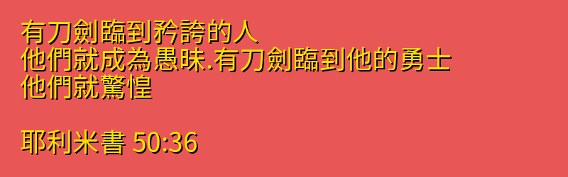 今日分享的中文聖經:「有刀劍臨到矜誇的人、他們就成為愚昧.有刀劍臨到他的勇士、他們就驚惶。」來自聖經「耶利米書」第「50章36節」,你可以繼續向下拉看到聖經卷書完整章節。每日中文聖經從神的話語中聆聽神的聲音,引導我們的人生,指導我們人生的方向,讓我們做出正確的選擇,而做出這些正確選擇的原則都在聖經中,所以我們需要讀神的話語,認識他的話語,把神的話語藏在心裡。
