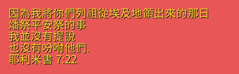 • 7:22 因為我將你們列祖從埃及地領出來的那日、燔祭平安祭的事、我並沒有提說、也沒有吩咐他們.