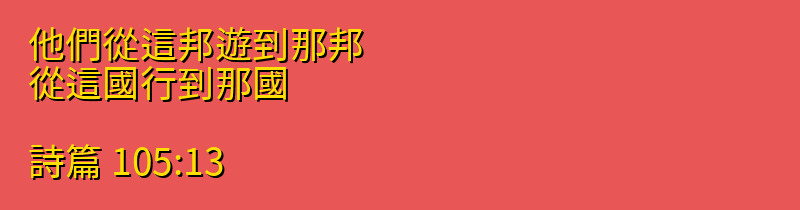 今日分享的中文聖經:「他們從這邦遊到那邦、從這國行到那國.」來自聖經「詩篇」第「105章13節」,你可以繼續向下拉看到聖經卷書完整章節。每日中文聖經從神的話語中聆聽神的聲音,引導我們的人生,指導我們人生的方向,讓我們做出正確的選擇,而做出這些正確選擇的原則都在聖經中,所以我們需要讀神的話語,認識他的話語,把神的話語藏在心裡。