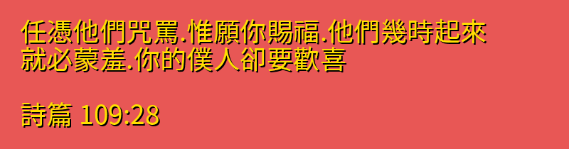 今日分享的中文聖經:「任憑他們咒罵.惟願你賜福.他們幾時起來、就必蒙羞.你的僕人卻要歡喜。」來自聖經「詩篇」第「109章28節」,你可以繼續向下拉看到聖經卷書完整章節。每日中文聖經從神的話語中聆聽神的聲音,引導我們的人生,指導我們人生的方向,讓我們做出正確的選擇,而做出這些正確選擇的原則都在聖經中,所以我們需要讀神的話語,認識他的話語,把神的話語藏在心裡。