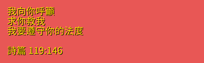 今日分享的中文聖經:「我向你呼籲、求你救我.我要遵守你的法度。」來自聖經「詩篇」第「119章146節」,你可以繼續向下拉看到聖經卷書完整章節。每日中文聖經從神的話語中聆聽神的聲音,引導我們的人生,指導我們人生的方向,讓我們做出正確的選擇,而做出這些正確選擇的原則都在聖經中,所以我們需要讀神的話語,認識他的話語,把神的話語藏在心裡。