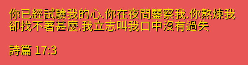 你已經試驗我的心.你在夜間鑒察我.你熬煉我、卻找不著甚麼.我立志叫我口中沒有過失。