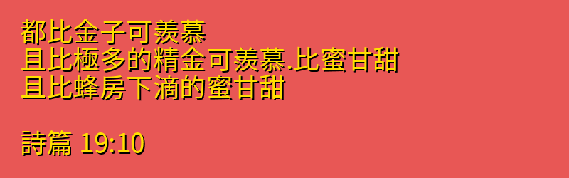 今日分享的中文聖經:「都比金子可羨慕、且比極多的精金可羨慕.比蜜甘甜、且比蜂房下滴的蜜甘甜。」來自聖經「詩篇」第「19章10節」,你可以繼續向下拉看到聖經卷書完整章節。每日中文聖經從神的話語中聆聽神的聲音,引導我們的人生,指導我們人生的方向,讓我們做出正確的選擇,而做出這些正確選擇的原則都在聖經中,所以我們需要讀神的話語,認識他的話語,把神的話語藏在心裡。