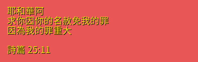 今日分享的中文聖經:「耶和華阿、求你因你的名赦免我的罪、因為我的罪重大。」來自聖經「詩篇」第「25章11節」,你可以繼續向下拉看到聖經卷書完整章節。每日中文聖經從神的話語中聆聽神的聲音,引導我們的人生,指導我們人生的方向,讓我們做出正確的選擇,而做出這些正確選擇的原則都在聖經中,所以我們需要讀神的話語,認識他的話語,把神的話語藏在心裡。